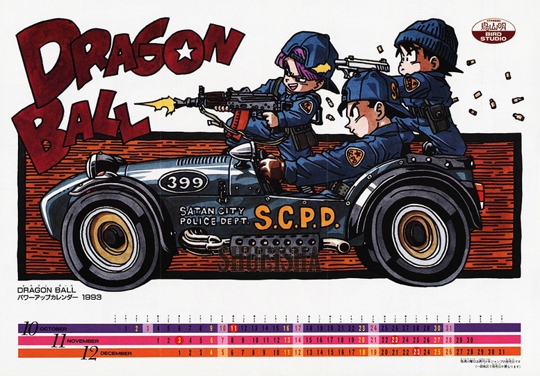 Na stronie obejmującej miesiące październik-grudzień pojawiają się Gohan, Goten i Trunks w aucie z napisem S.C.P.D. (Satan City Police Department). Pojazd i ich jednakowe stroje, przypominające mundury oddziałów specjalnych, prezentują się znakomicie.
