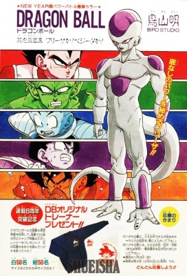 Ilustracja przedstawia przemienionego Freezę – naprzeciw piątki wojowników. Zastosowanie odrębnych, symbolicznych kolorów dla każdej postaci potęguje wyrazistość tej dramatycznej sceny.